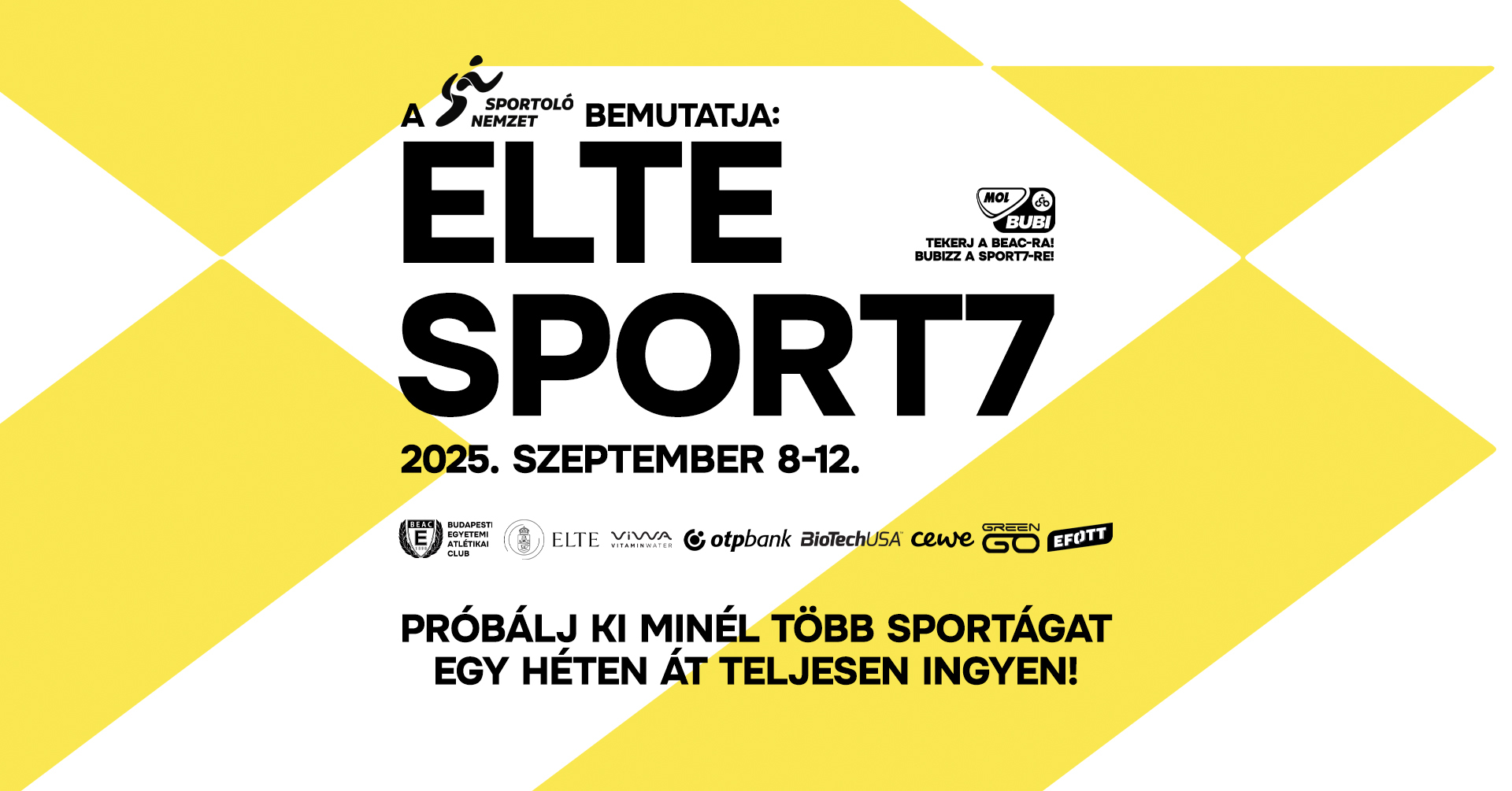A Sportoló Nemzet, az ELTE, a BioTechUSA, a Viwa Vitaminwater, a MOL Bubi, az OTP Bank Nyrt., az EFOTT, a GreenGo, valamint a CEWE támogatásával idén is a BEAC sportágválasztójával, az ELTE Sport7-tel indítjuk a tanévet. Részletek