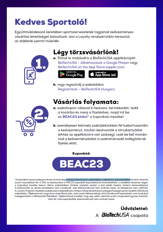 Ahogyan ígértük, minden október 30. és november 16. között regisztrálónak elküldjük exkluzív BioTechUSA kedvezménykódunkat, amellyel 15% kedvezménnyel tudtok vásárolni a shop.biotechusa.hu weboldalon, valamint a szaküzletekben.